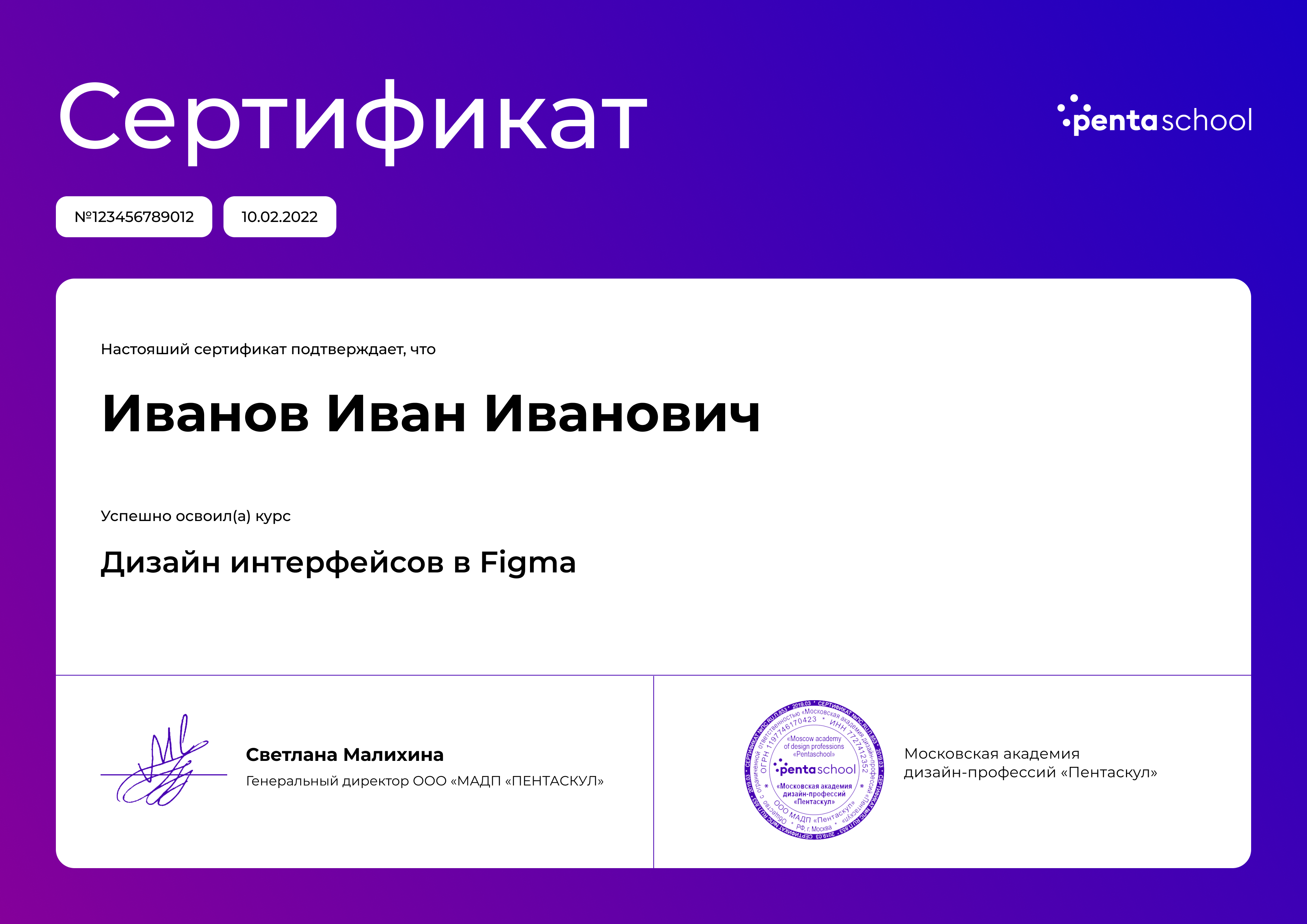 По итогу обучения вы получите сертификат академии дизайна Pentaschool